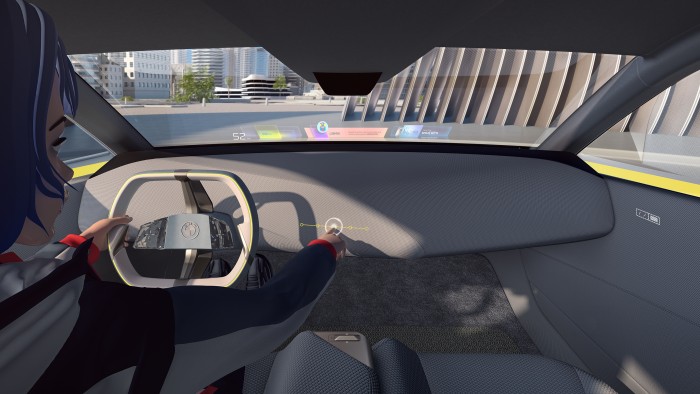 Inside, vehicle materials, control devices and displays are minimized to create an environment where you can focus on digital experiences and new levels of driving pleasure. In the center of the steering wheel, a vertical spoke design that deviated from the traditional method was applied. By implementing a touch point that is activated when the driver's hand approaches or is touched, it can be easily operated with just a thumb movement. With these physical touchpoints, the driver can select the information displayed on the windshield, and it has been implemented to realize the basic principle of the head-up display: 'eyes on the road, hands on the steering wheel'.
