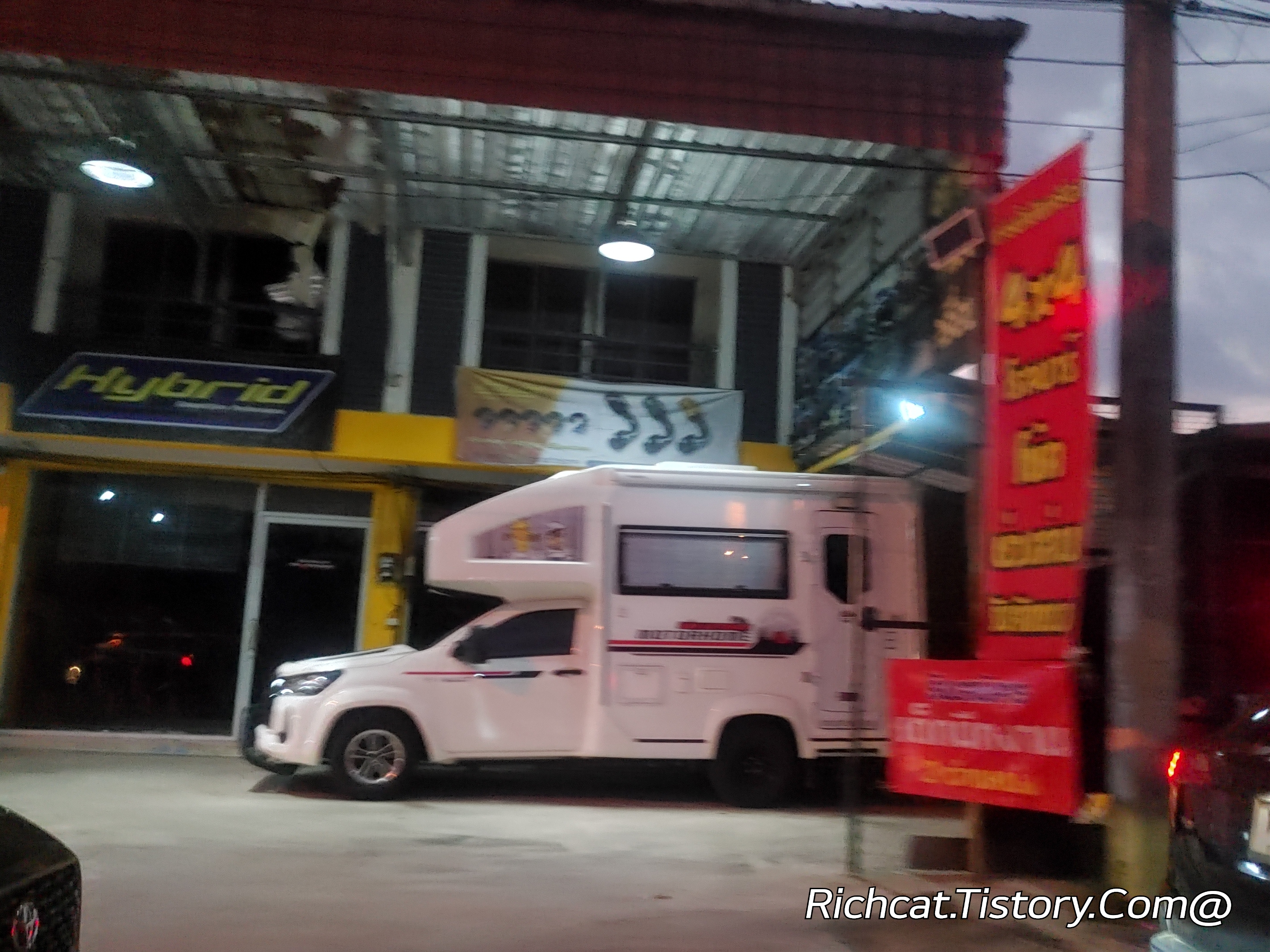 이 차량은 태국에서 흔한 썽태우에 쓰이는 픽업트럭을 기반으로 만든 캠핑카이다