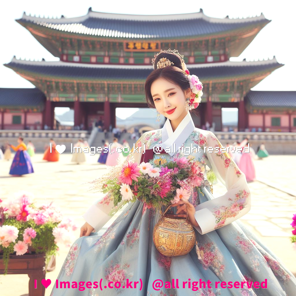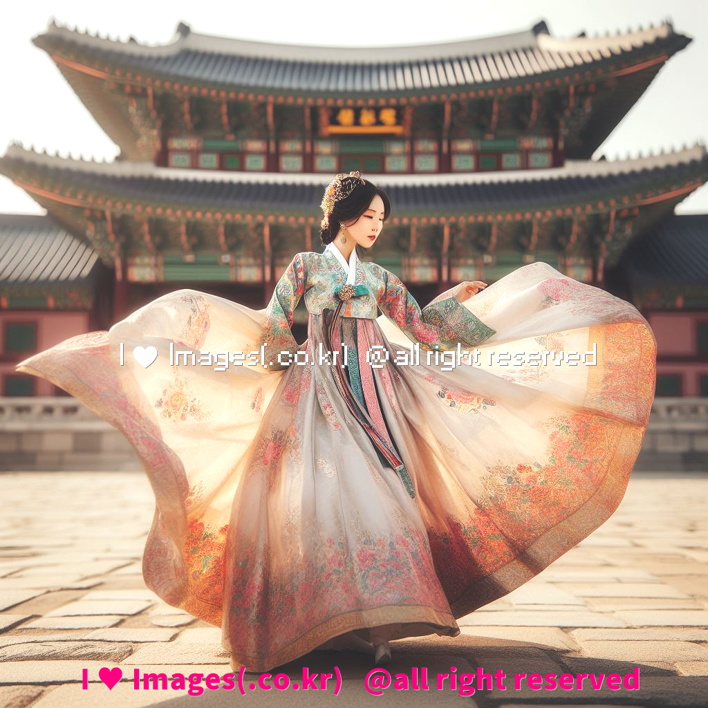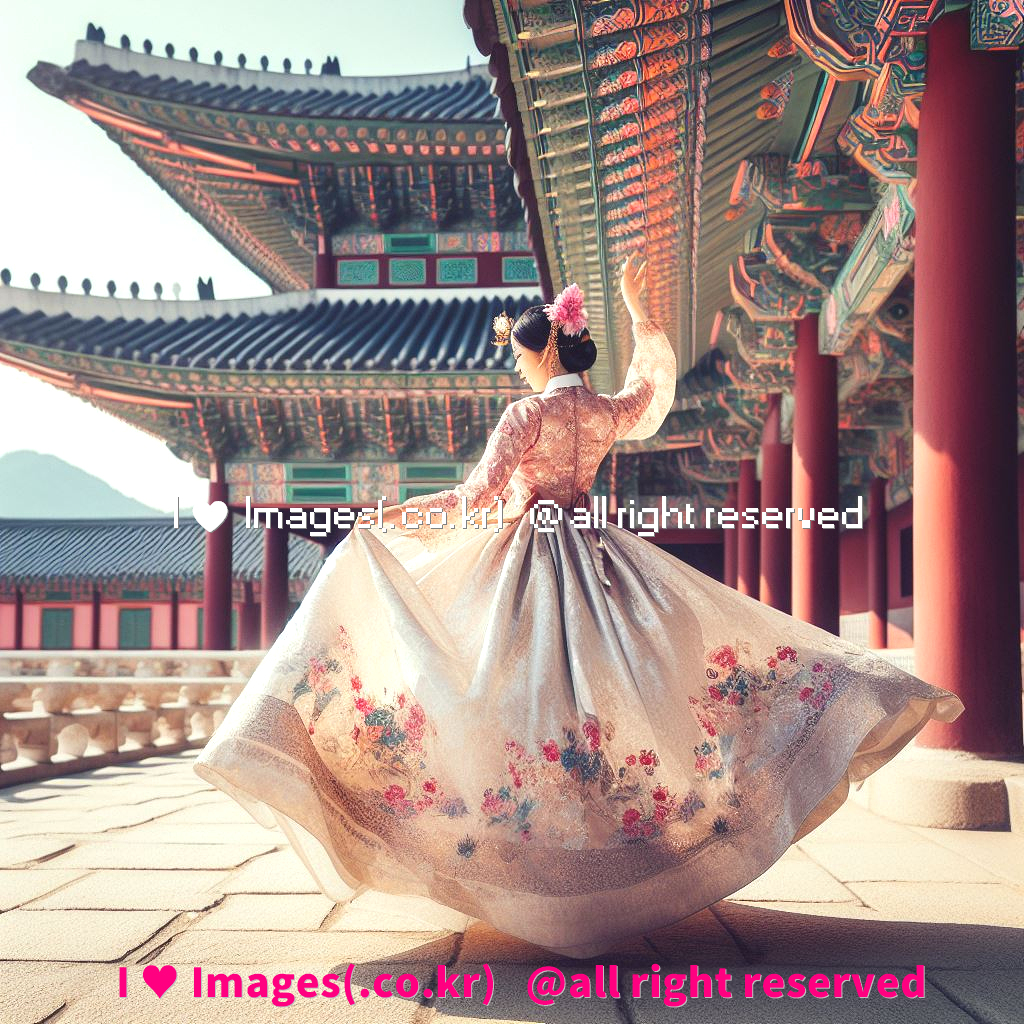 한복입고 경복궁 앞에서 춤추는 동양 여자, An oriental woman dancing in front of Gyeongbokgung Palace wearing a hanbok: I ♥ Images