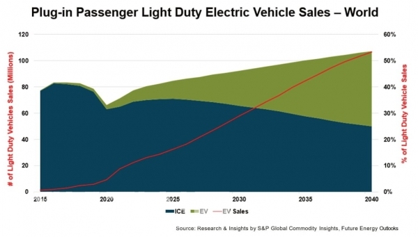 Platts said that internal combustion locomotives peaked in 2016 and entered a downward trend, and that the rapid growth of electric vehicles will continue. Accordingly, it is predicted that electric vehicle sales will be 27 million units in 2030, accounting for about 30% of the total automobile market, and will expand to 57 million units in 2040, exceeding the internal combustion engine sales volume with a market share of about 54%.