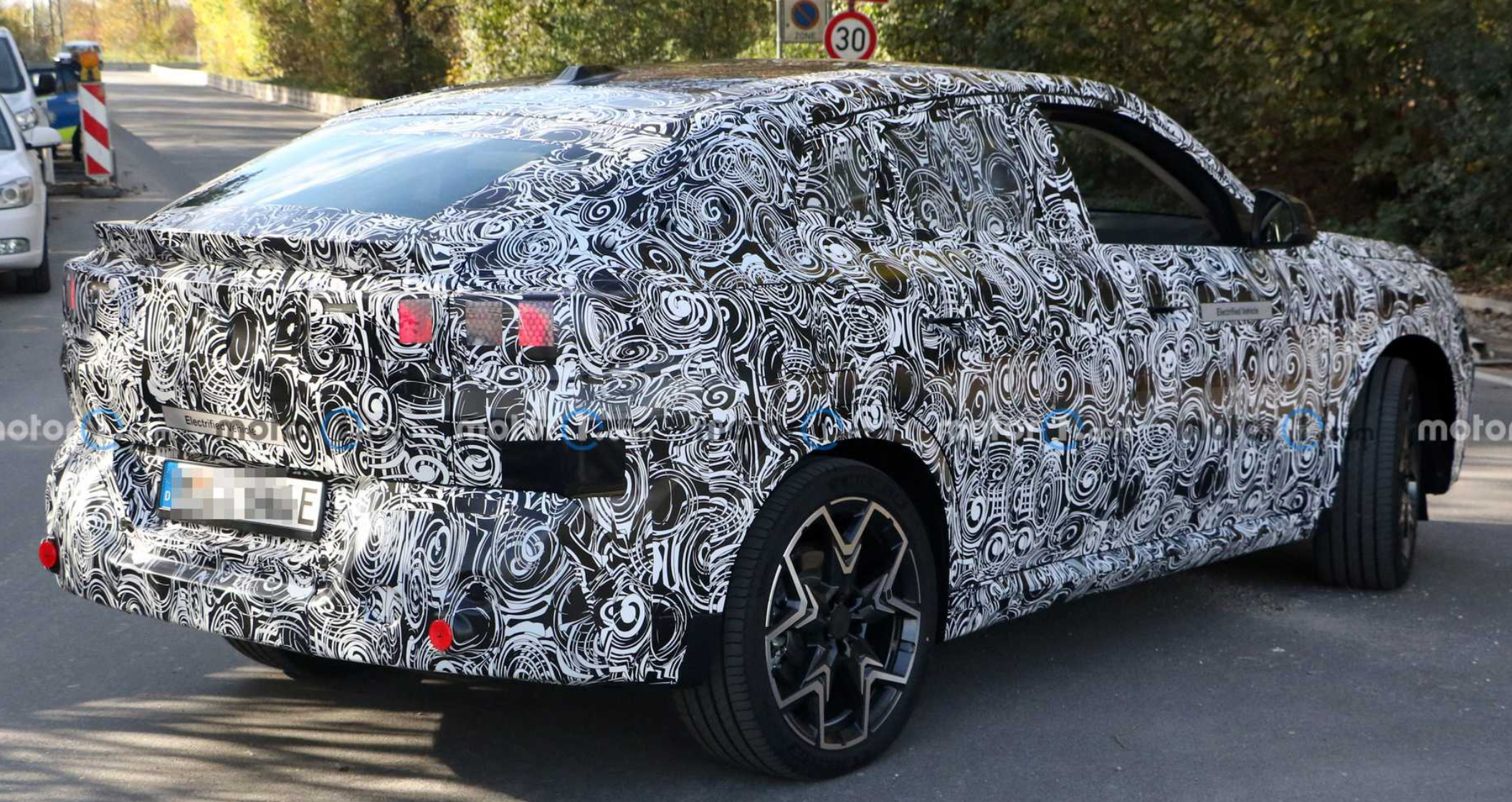 이것은 우리가 이미 발견한 가솔린 버전과 매우 흡사한 EV의 첫 번째 모습입니다. 그러나 전면 도어의 큰 "Electric Vehicle" 스티커, 후면 원자 아래에 자리 잡은 배기 시스템의 부재, 닫힌 그릴은 이 자동차의 파워트레인을 드러냅니다. 크로스오버는 스타일링 세부 사항을 숨기는 전신 위장 랩을 착용하지만 경사진 쿠페 같은 지붕은 쉽게 알아볼 수 있습니다. X2는 후면에 있는 더 큰 X4에서 몇 가지 신호를 빌리고 전면 근막을 다시 스타일링하는 데 좀 더 신중한 접근 방식을 취하고 있습니다.